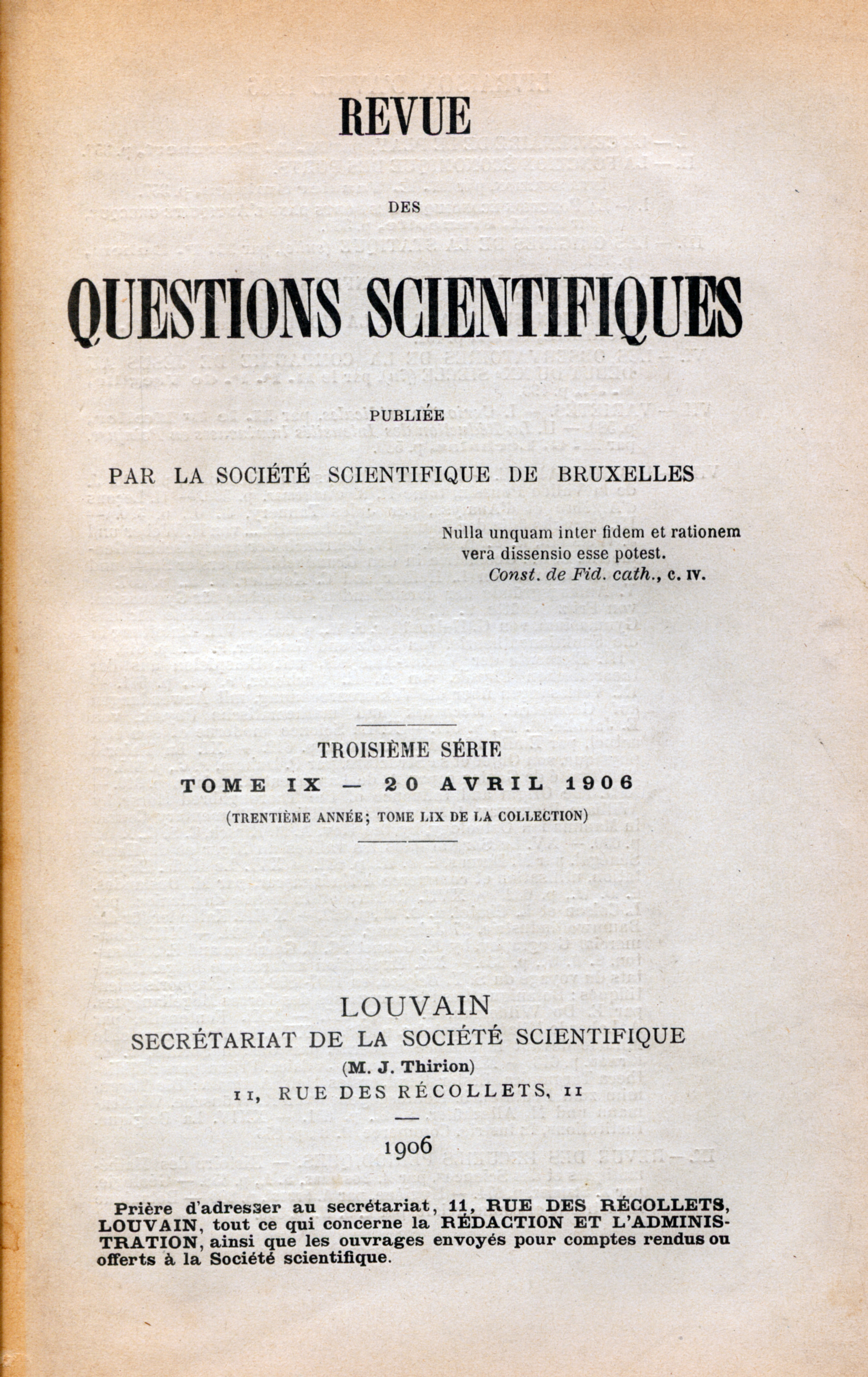 Duhem (Pierre), Les origines de la statique (X), in Revue des Questions Scientifiques, 30e année, t. 59 (3e série, t. 9), 20 avril 1906, n°2, p. 383-441.