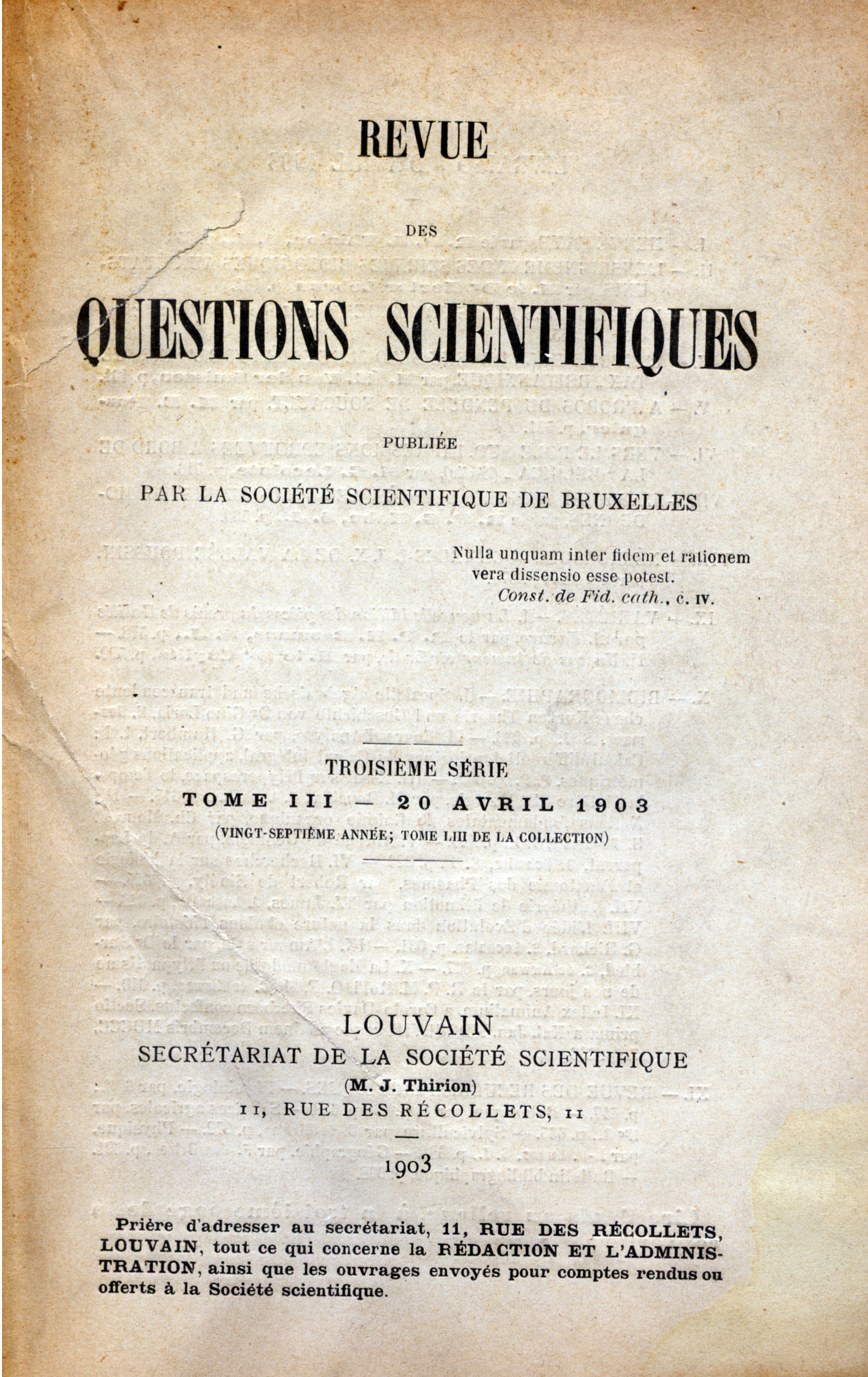 La Rédaction, Table des matières du troisième volume (troisième série), Tome LIII de la collection, in Revue des Questions Scientifiques, 27e année, t. 53 (3e série, t. 3), 20 avril 1903, n°2, p. 701-704.