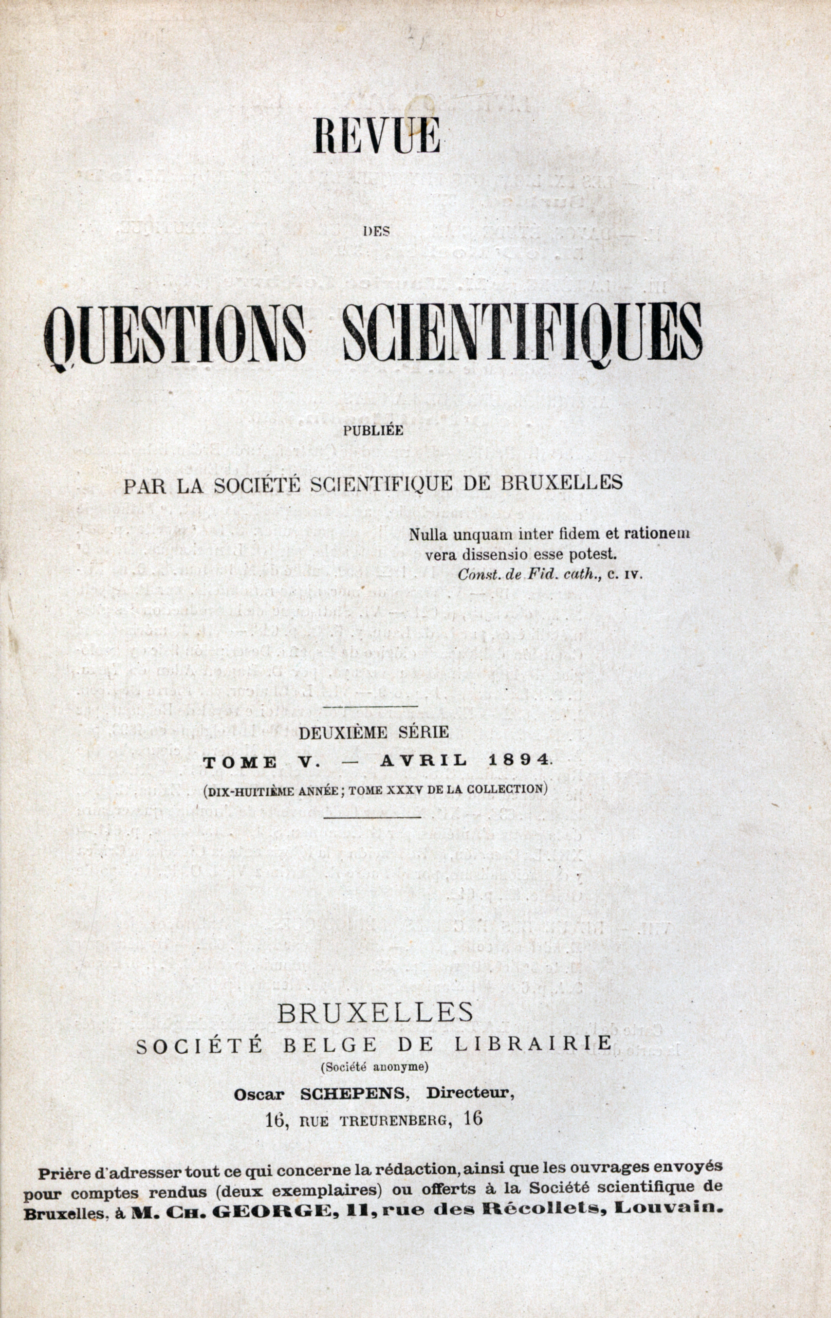 La Rédaction, Table des Matières du cinquième volume ( deuxième série), Tome XXXV de la collection, in Revue des Questions Scientifiques, tome 35, 1894, n°2, p. 689-692.