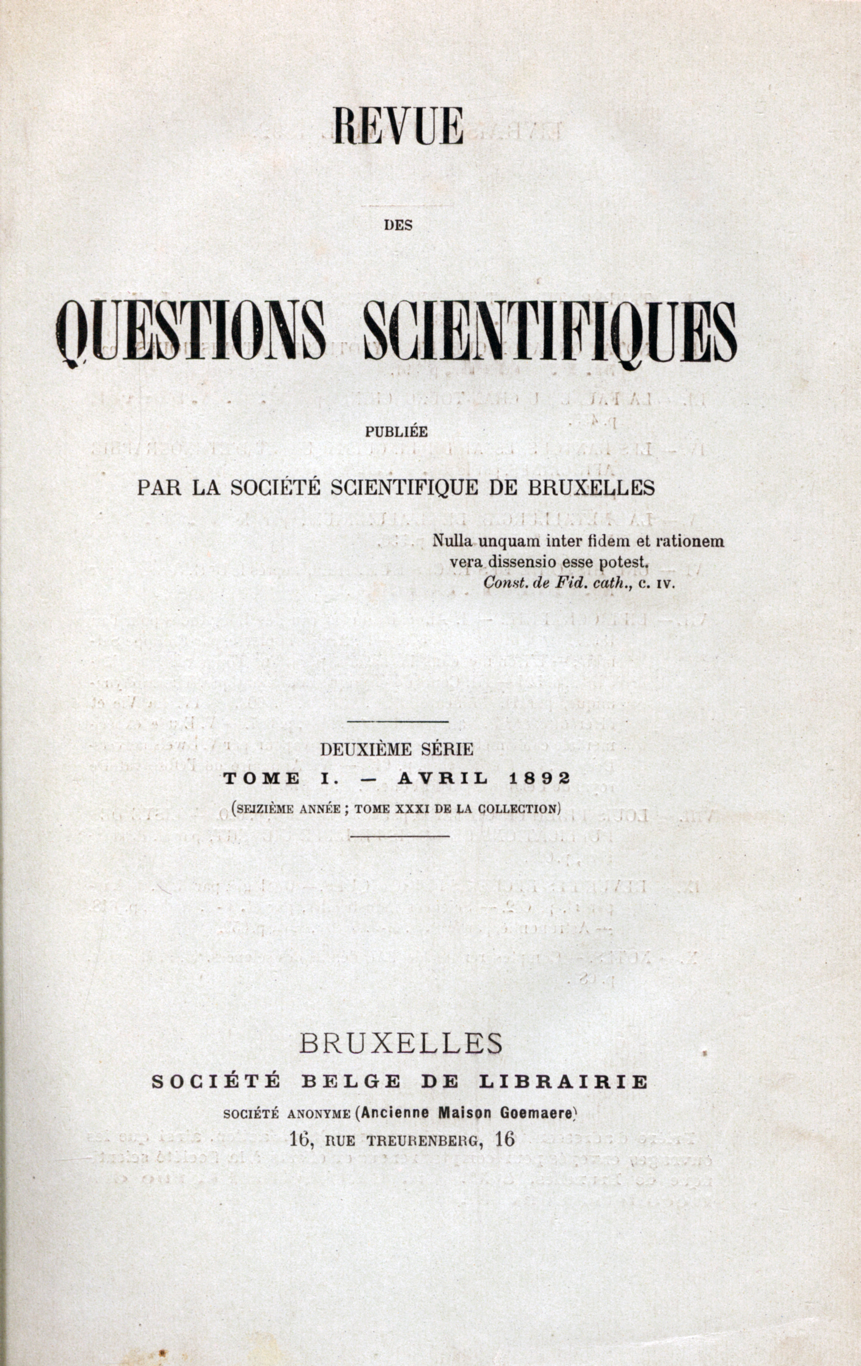 La Rédaction, Table des Matières du Premier Volume (deuxième série), Tome XXXI de la collection, in Revue des Questions Scientifiques, 16e année, t. 31 (2e série, t. 1), avril 1892, n°2e livraison, p. 693-695.