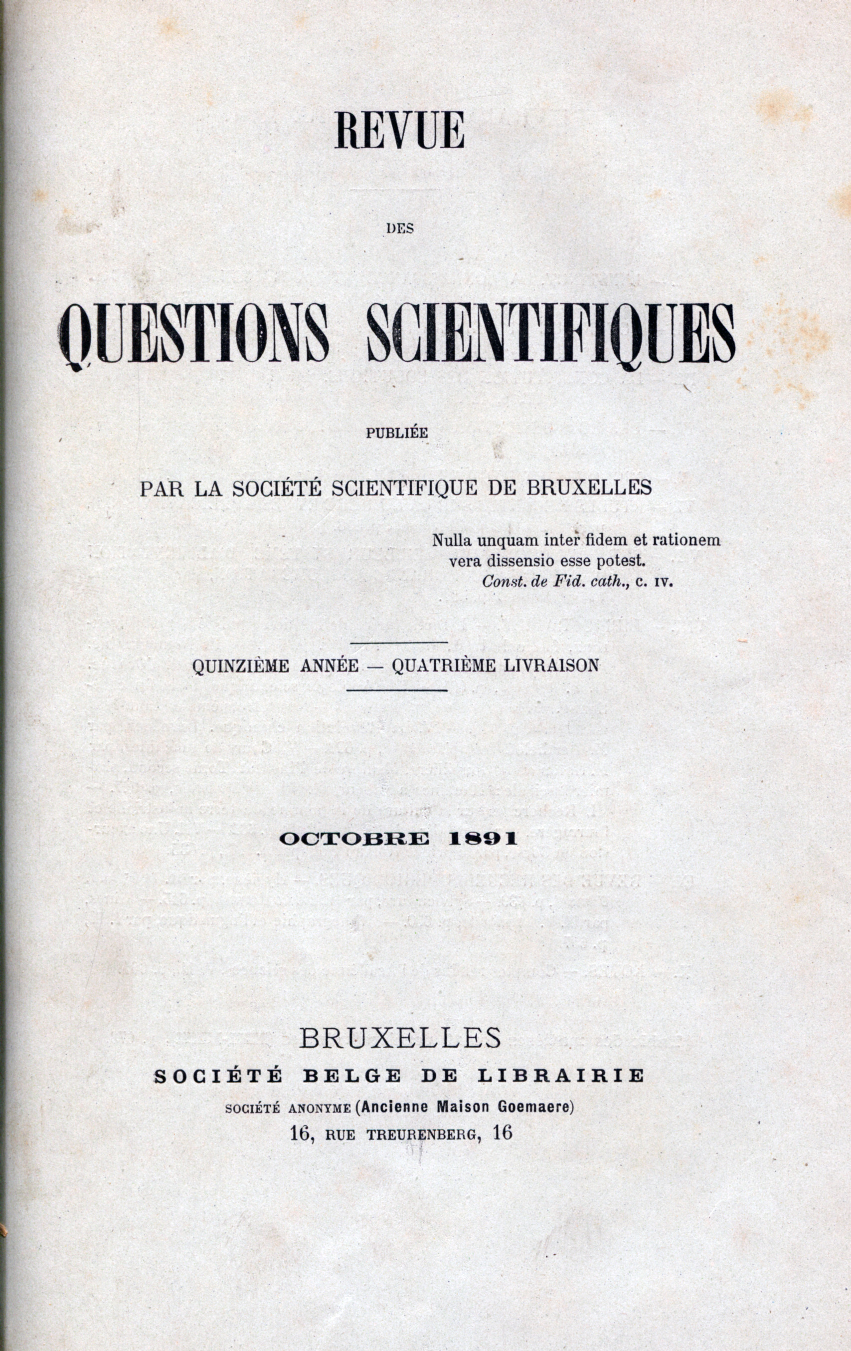 La Rédaction, Table des Matières du trentième volume, in Revue des Questions Scientifiques, 15e année, t. 30, octobre 1891, n°4e livraison, p. 669-672.