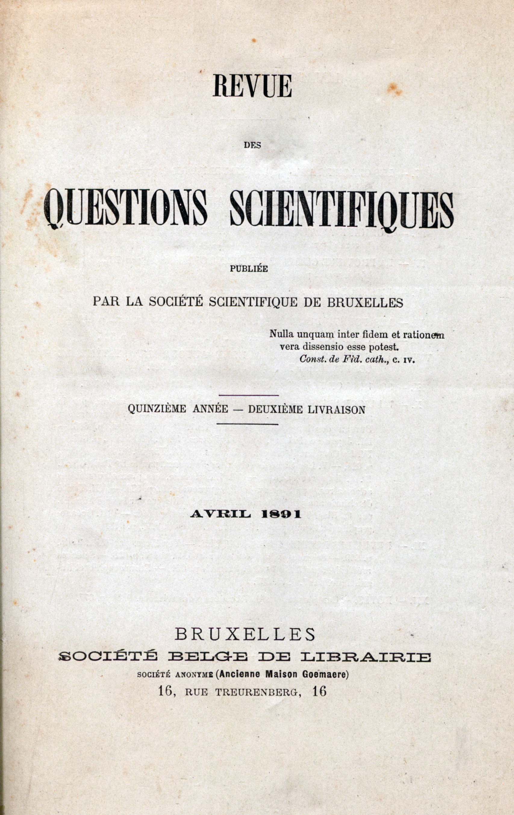 La Rédaction, Table des Matières du vingt-neuvième volume, in Revue des Questions Scientifiques, 15e année, t. 29, avril 1891, n°2e livraison, p. 687-688.