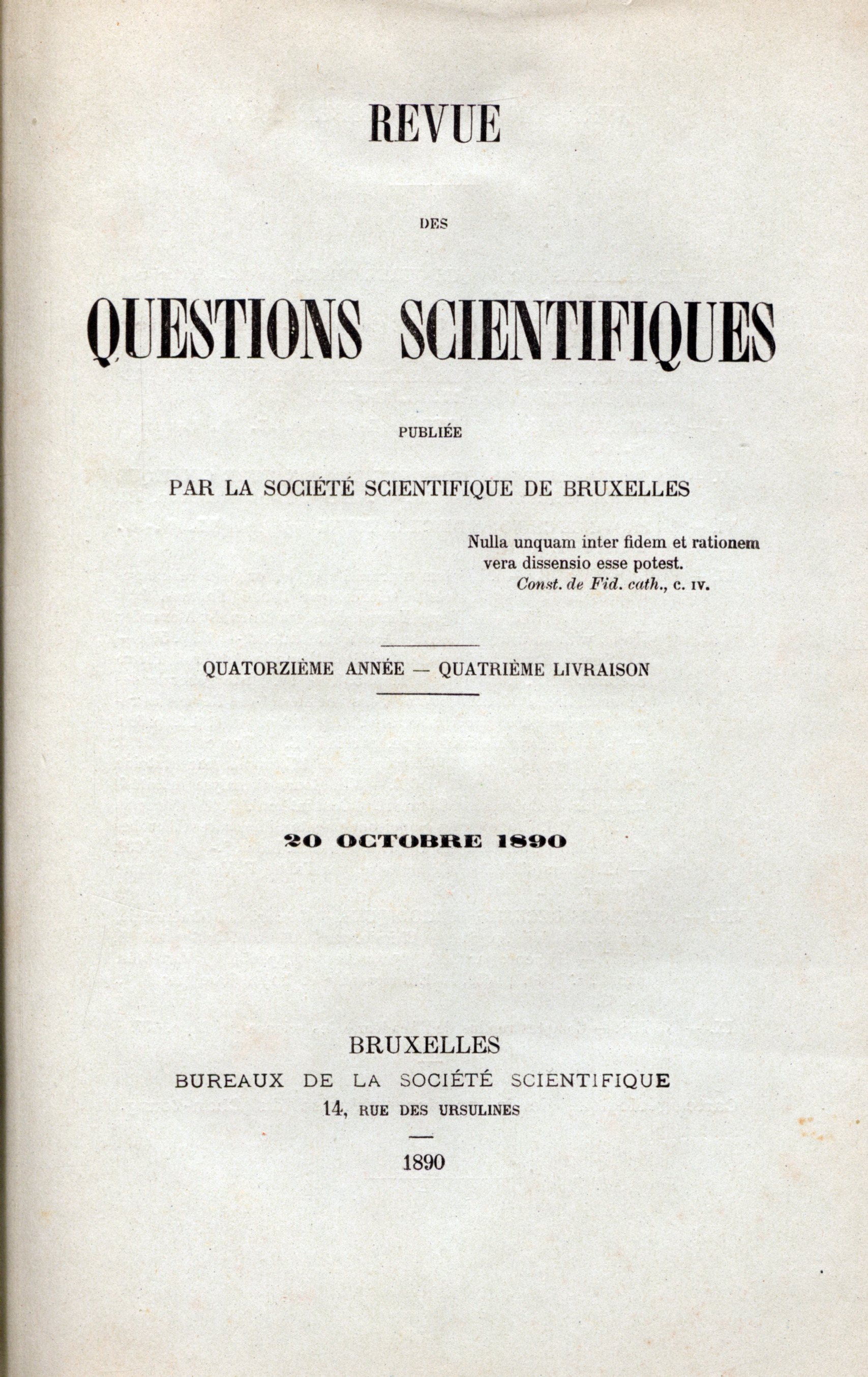 La Rédaction, Table des Matières du vingt-huitième volume, in Revue des Questions Scientifiques, 14e année, t. 28, 20 octobre 1890, n°4e livraison, p. 685-688.