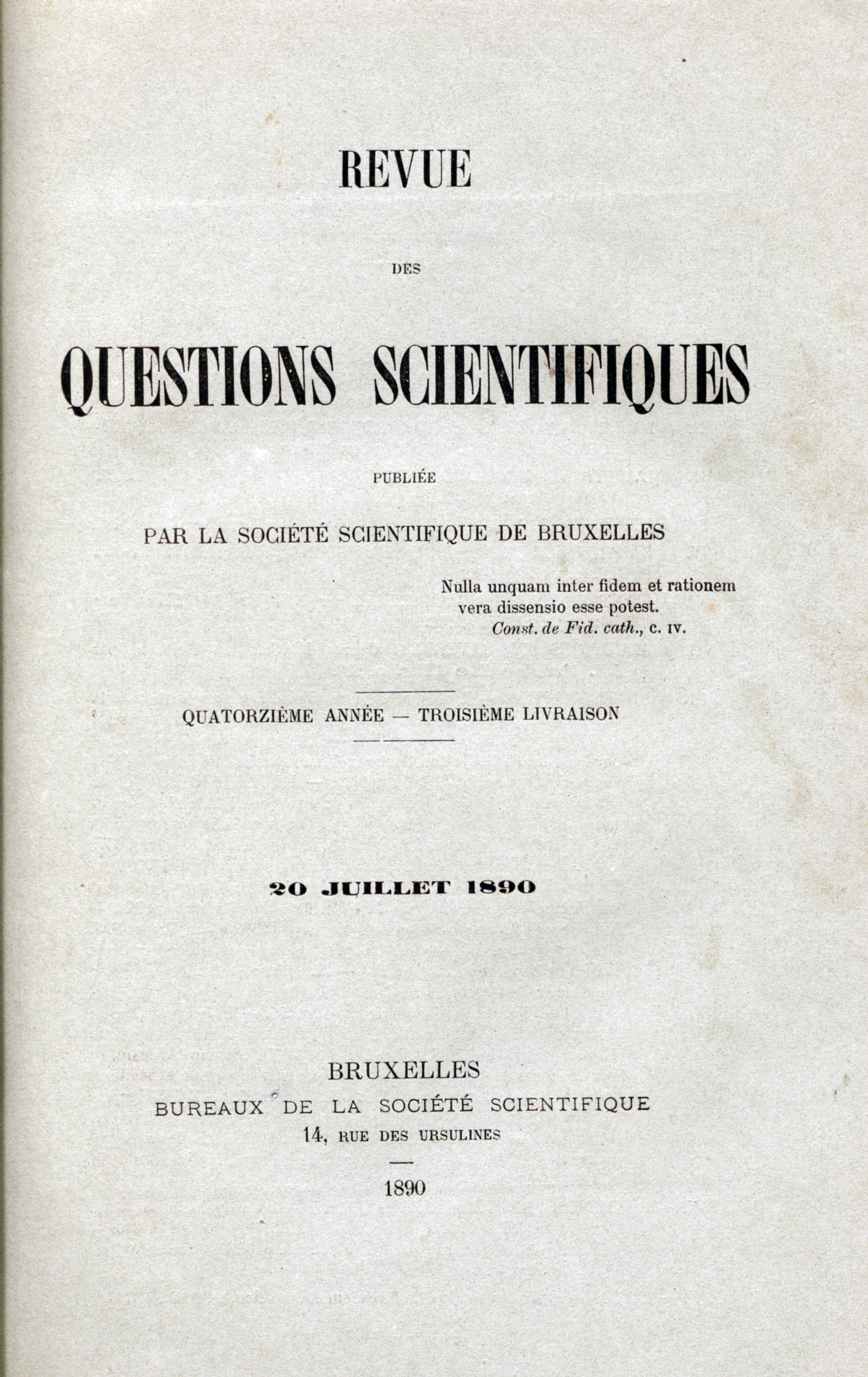 Verhelst (François), Physique, in Revue des Questions Scientifiques, 14e année, t. 28, 20 juillet 1890, n°3e livraison, p. 316-321.