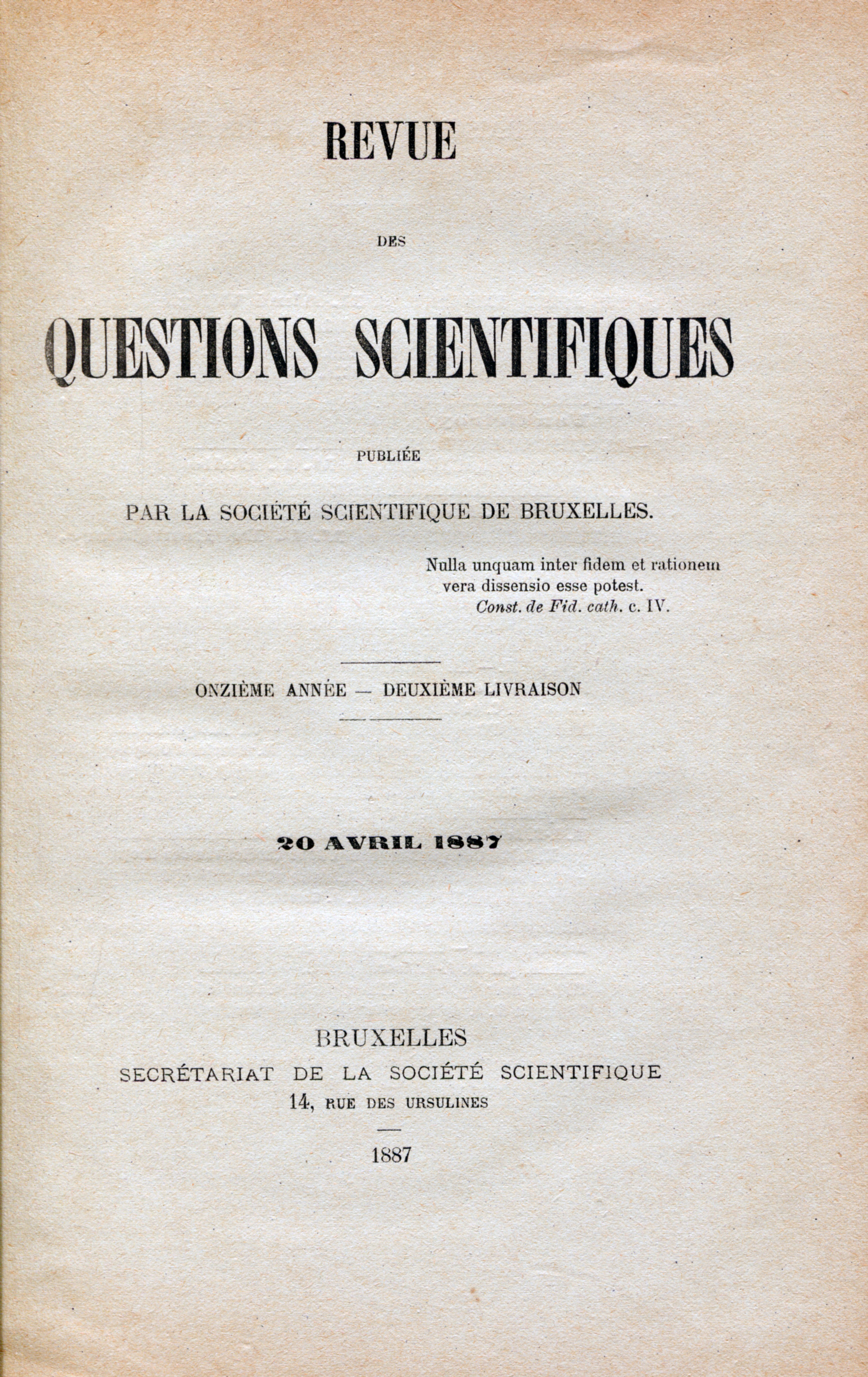 La Rédaction, Table des Matières du vingt et unième volume, in Revue des Questions Scientifiques, 11e année, t. 21, 20 avril 1887, n°2e livraison, p. 695-695.