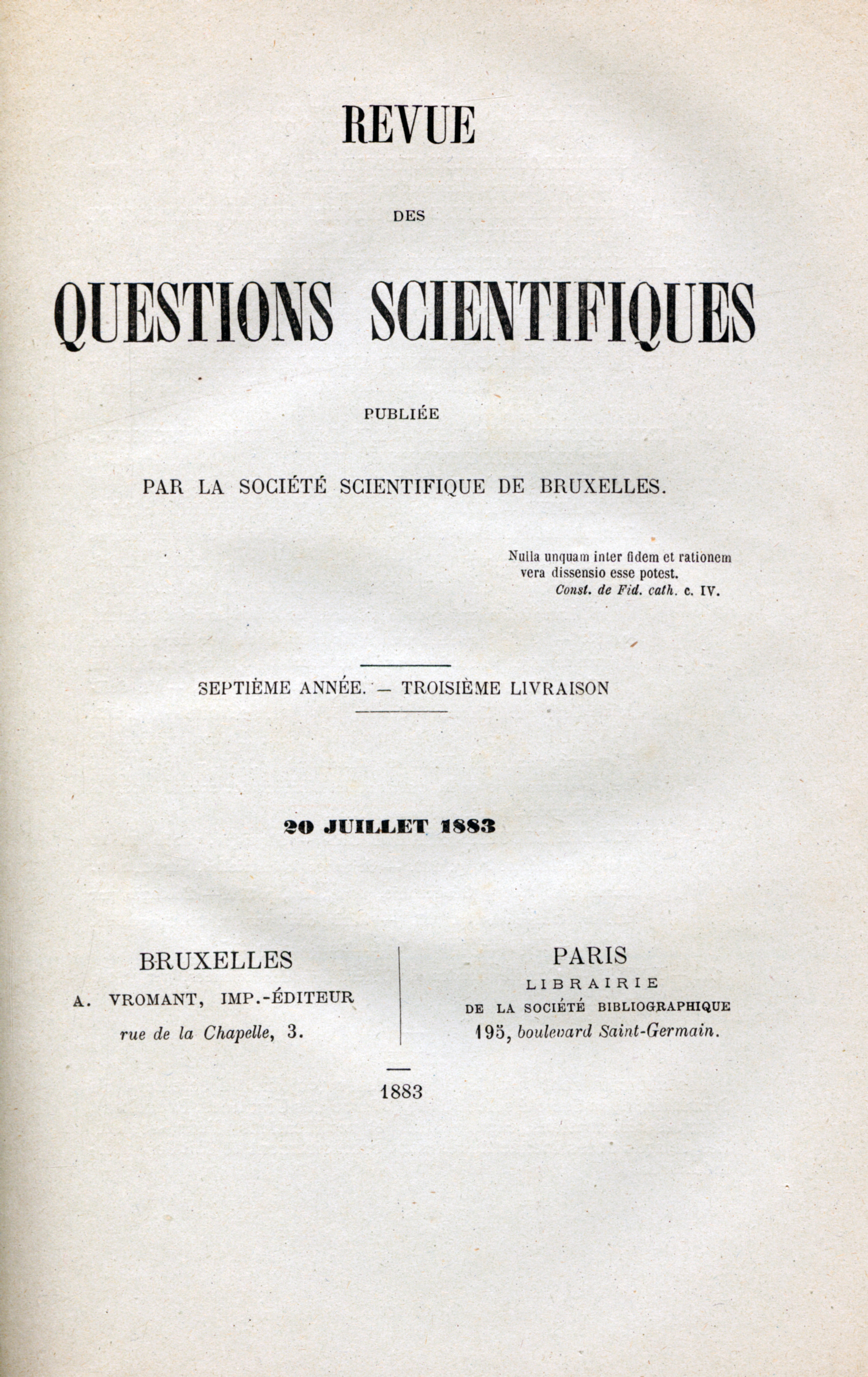 Van Tricht (Victor), Physique, in Revue des Questions Scientifiques, 7e année, t. 14, 20 juillet 1883, n°3e livraison, p. 290-297.